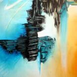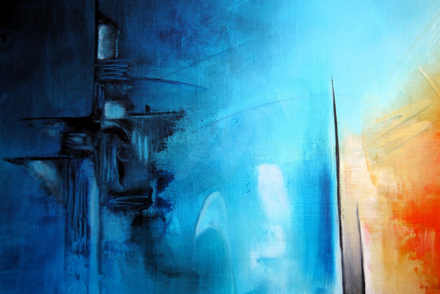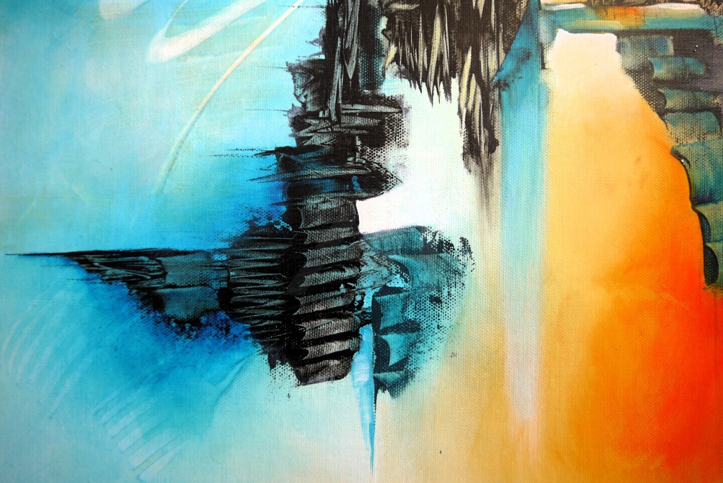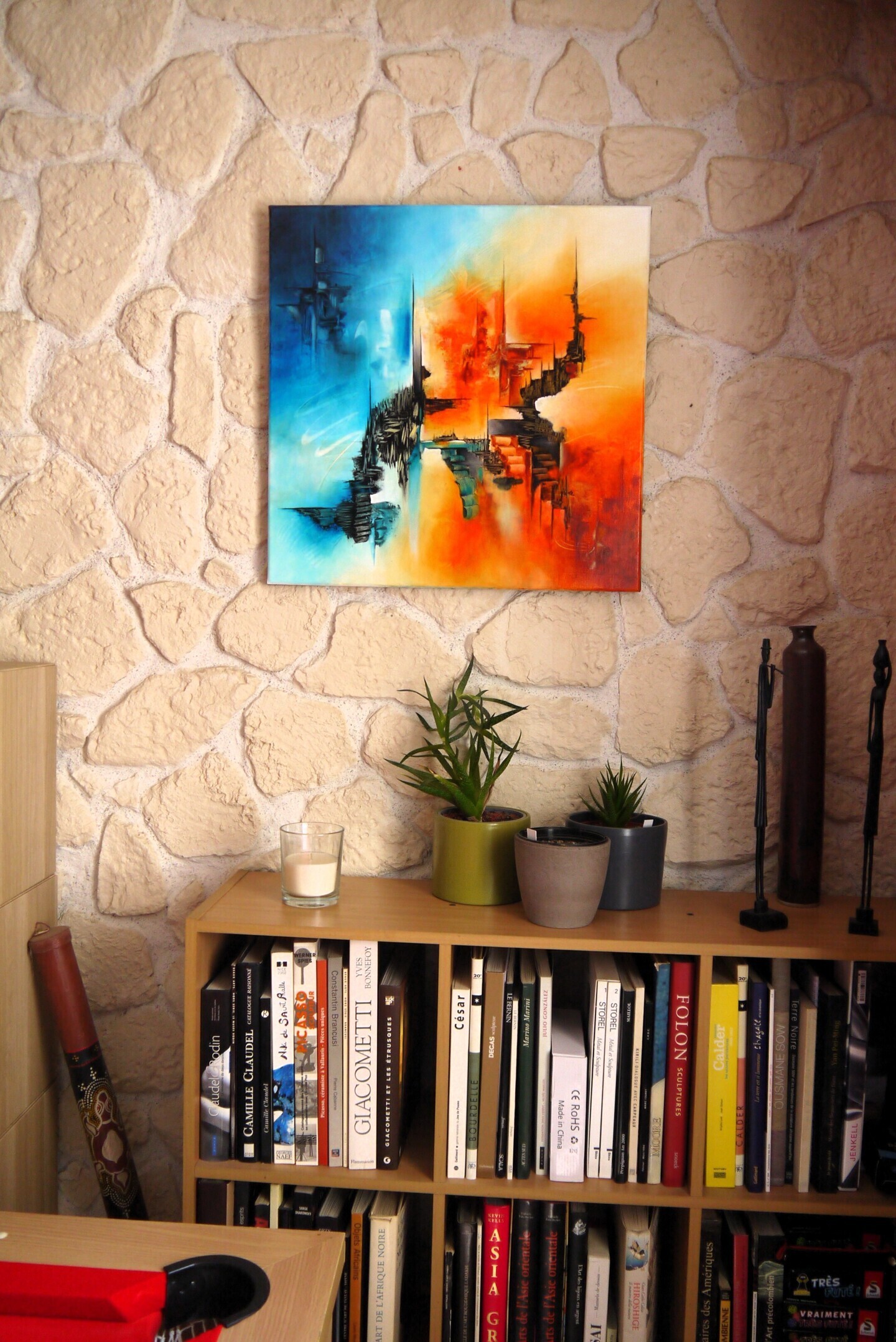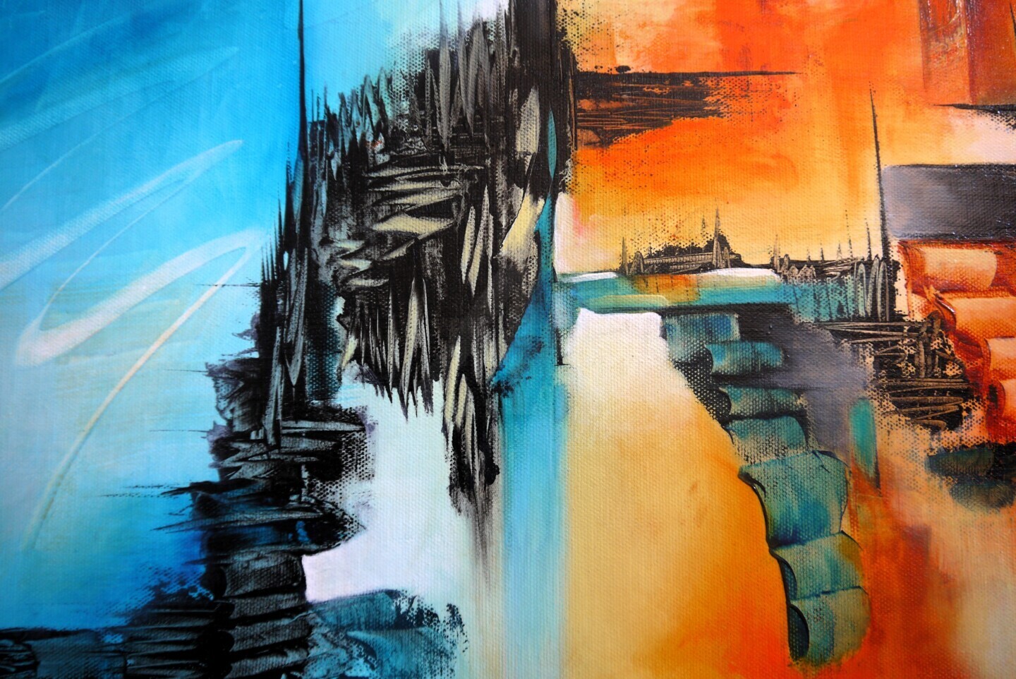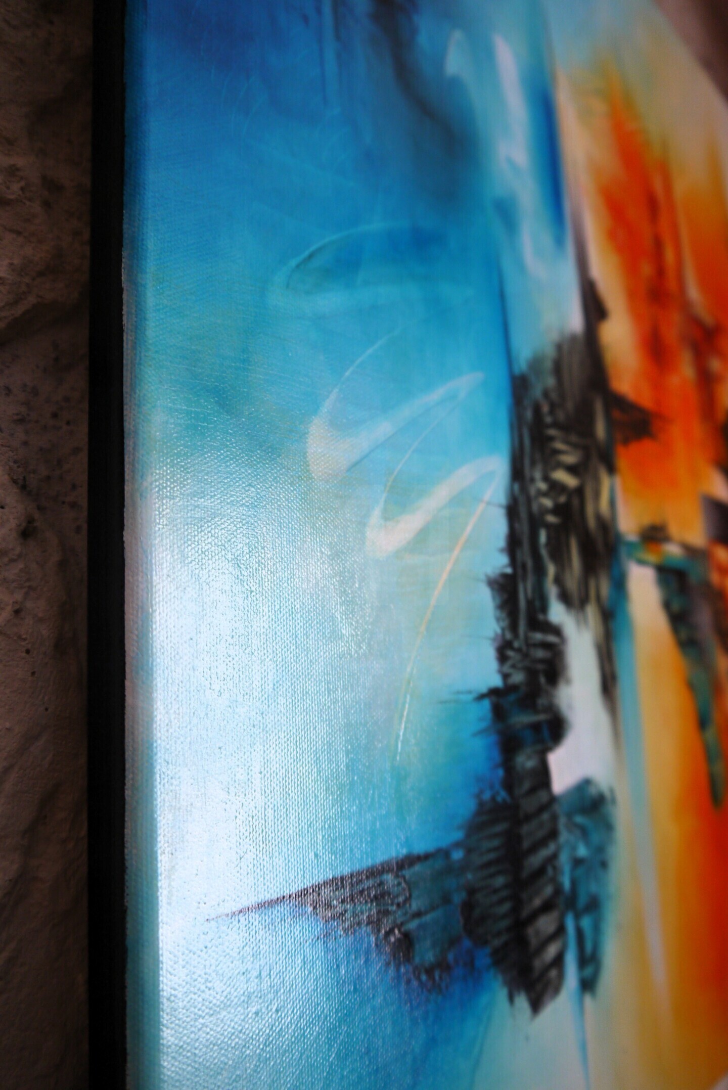 L'atmosphère générale de cette peinture abstraite est puissante et contrastée. L'opposition entre le bleu froid et l'orange chaud crée une tension visuelle captivante. La peinture est à la fois dynamique et contemplative, laissant une large place à l'interprétation personnelle. L'ambiance est onirique, voire surréaliste.