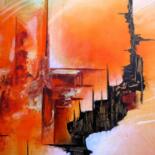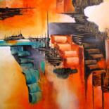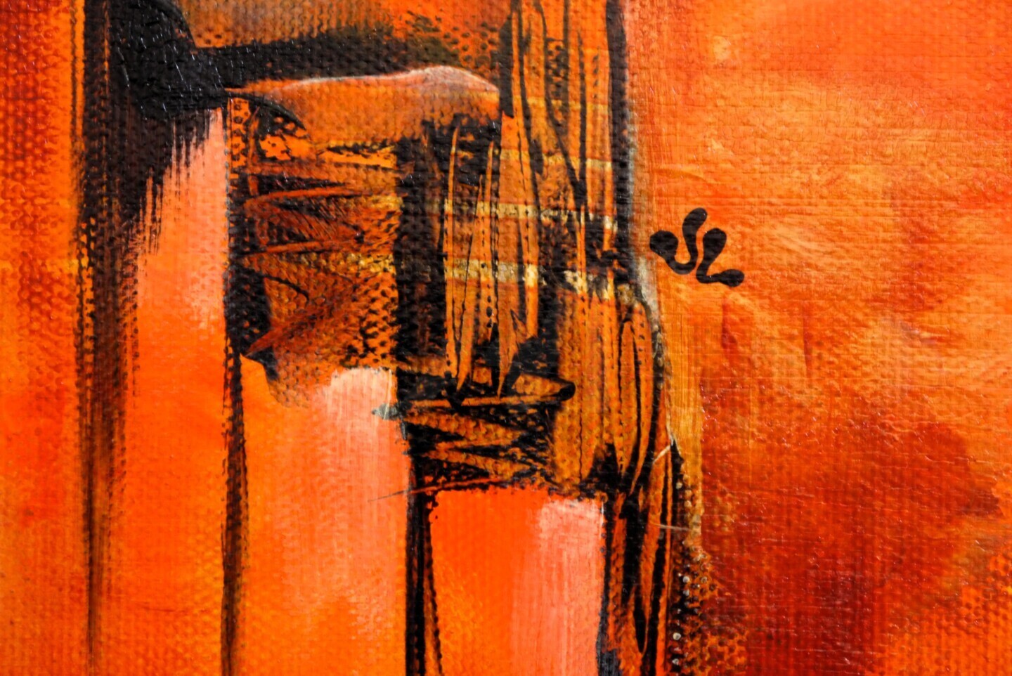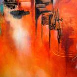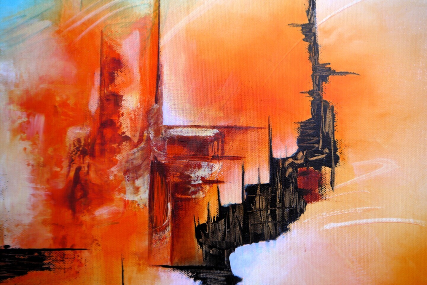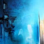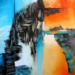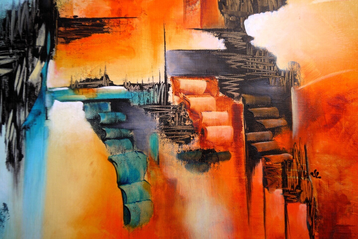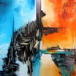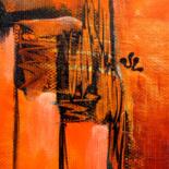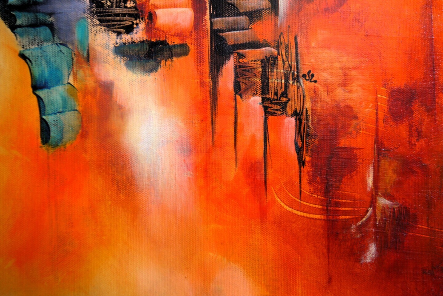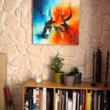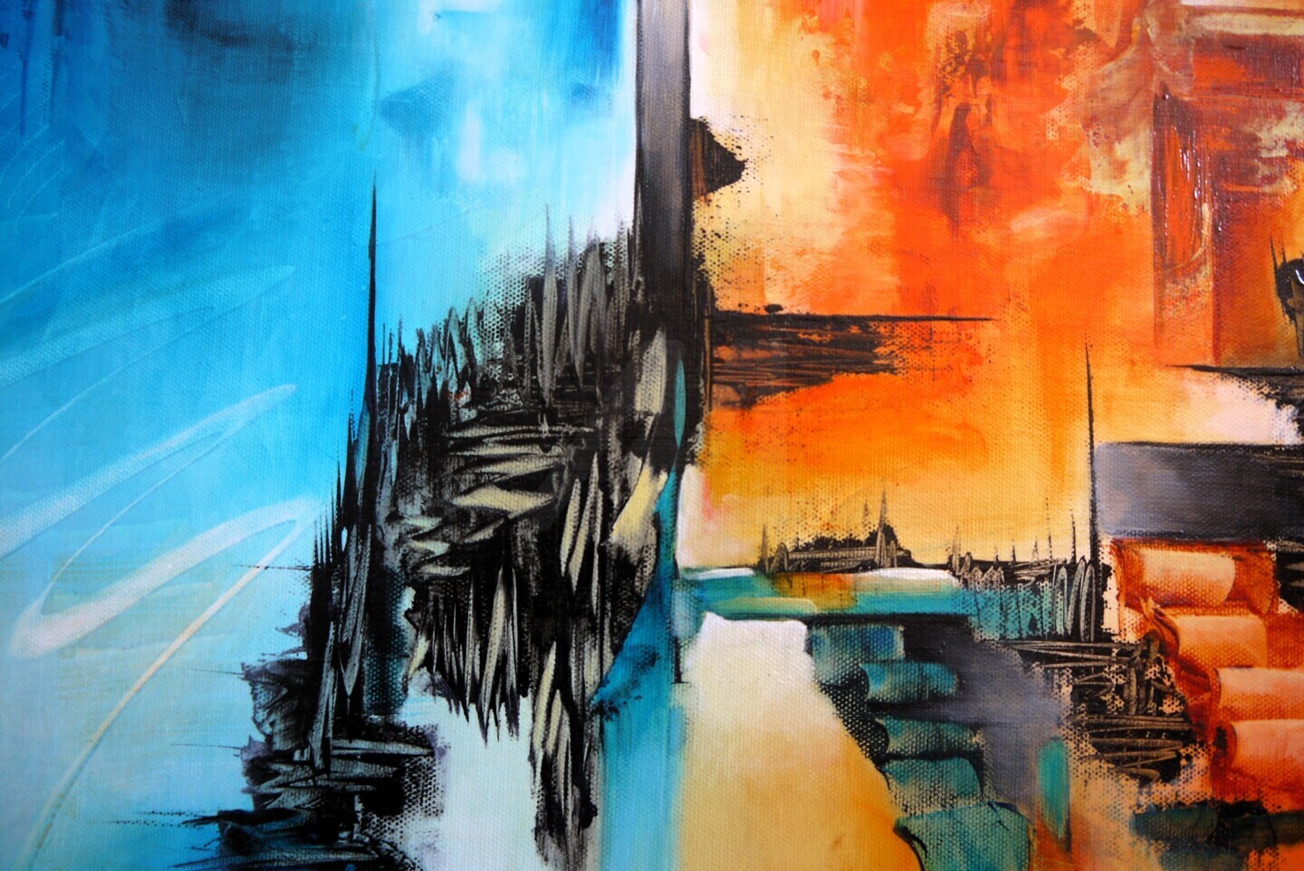 L'atmosphère générale de cette peinture abstraite est puissante et contrastée. L'opposition entre le bleu froid et l'orange chaud crée une tension visuelle captivante. La peinture est à la fois dynamique et contemplative, laissant une large place à l'interprétation personnelle. L'ambiance est onirique, voire surréaliste.
